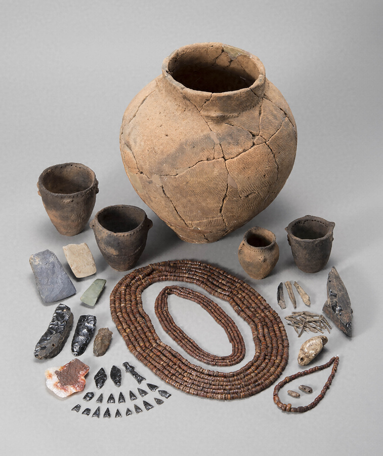 石器には石鏃やナイフのほか、ヒト形の石偶(異形石器)がある。また、サハリン産と推定される琥珀をつかった琥珀玉は総数約2500点にものぼる。これは同時代の北海道全体で見ても突出した数であり、この地域にオホーツク海沿岸の交易ルートをおさえる有力な勢力の存在したことを伺わせる資料である。重要文化財「北海道常呂川河口遺跡墓坑出土品」の構成資料。