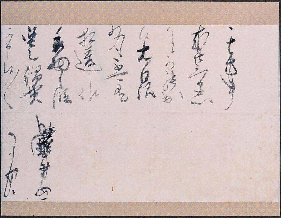 宛名は不明であるが、折紙形式の書状を広げたまま表具したので下部が逆になっている。書き出しに「其方事」とあって目下の者への簡単な内容で、来る二十三日に相違なく罷り出よ、委細は使者の綿貫が申すと達者な速筆で書かれている。