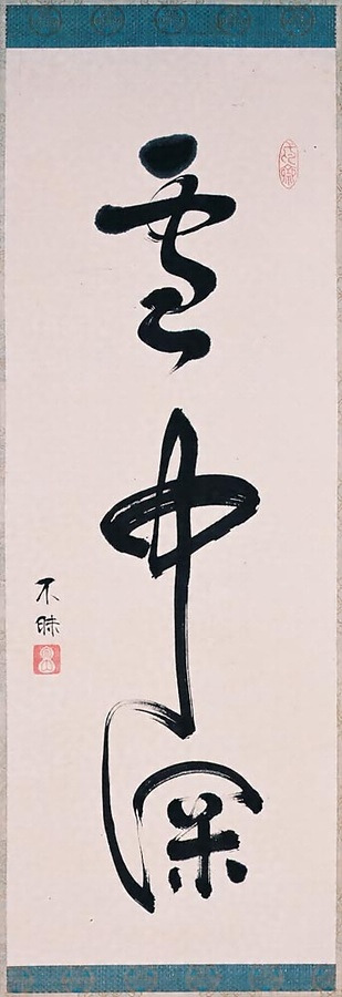 松平不昧は、武家茶湯と称される石州流の茶人大名、出雲松江の藩主、名は治好、のち治郷と称した。藩政改革に治水や河川改修・新田開発、また各種殖産にも及んだ。少年時代から茶道に励み、茶道を修身治国の資たるべしと説いている。茶道の名物も収集し、その収蔵品を「雲州蔵帳」と呼ぶ。本幅は雪深い出雲を連想させる手慣れた筆蹟で、書風は遠州流を引き継いだ特色のある名筆である。