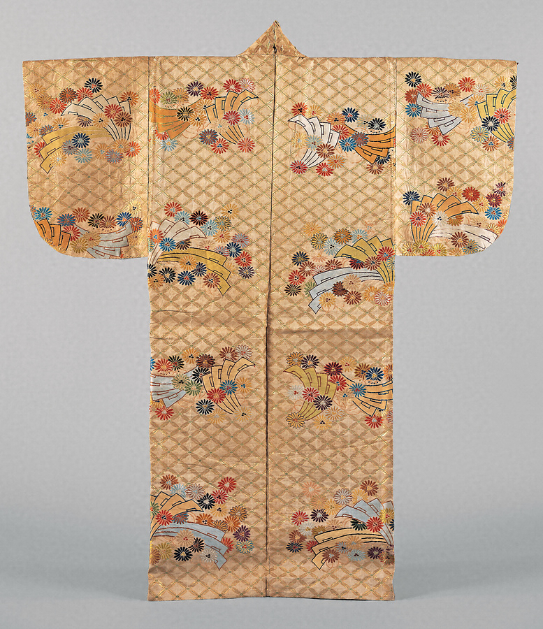白綾地に金と萌黄の緯糸で七宝繋模様を織り表し、上文として檜扇と唐松を様々な色緯で軽快に織表した唐織である。檜扇には薄紅色の紐が表されている。