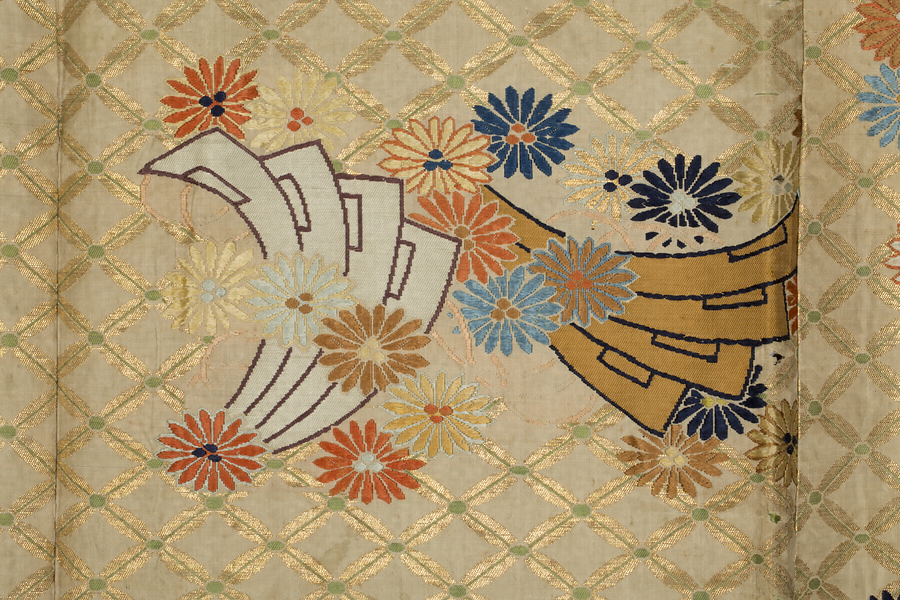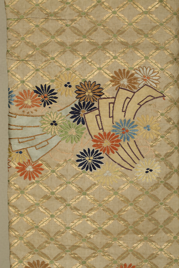 白地七宝繋唐松檜扇模様唐織