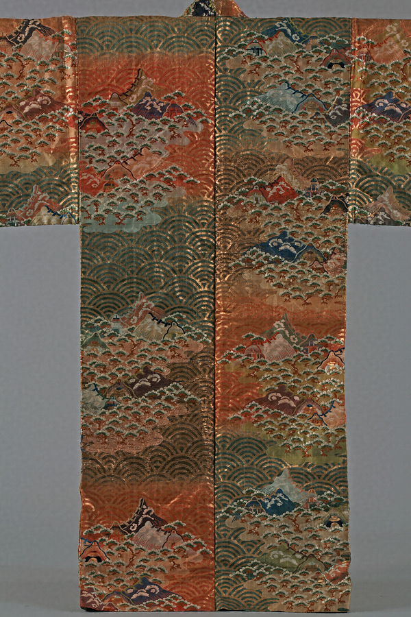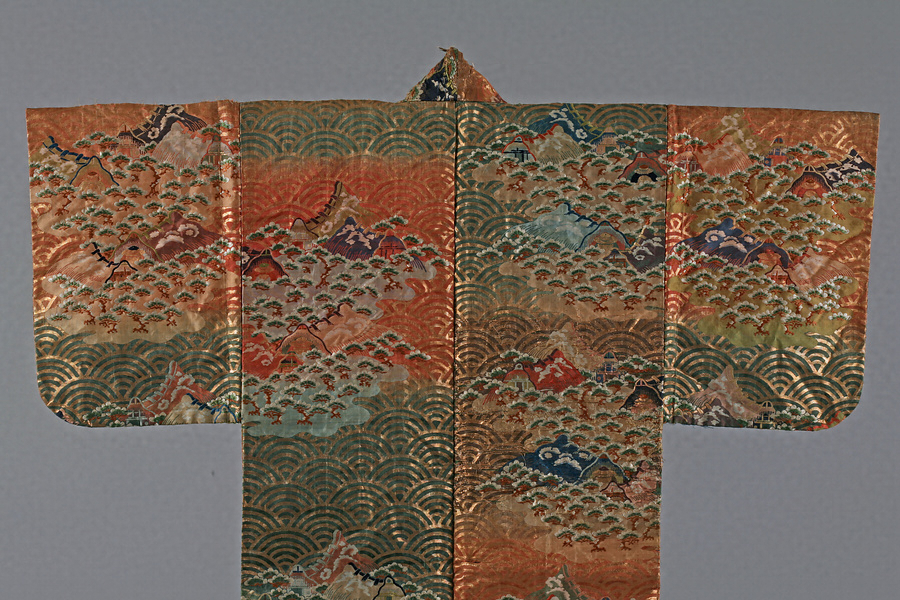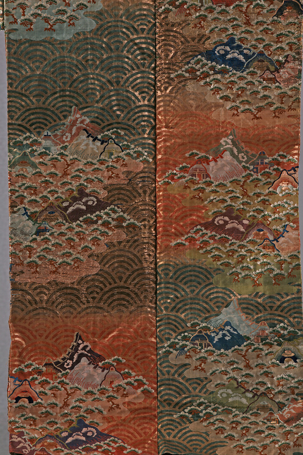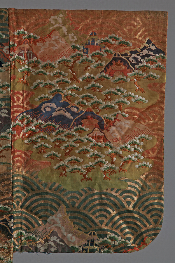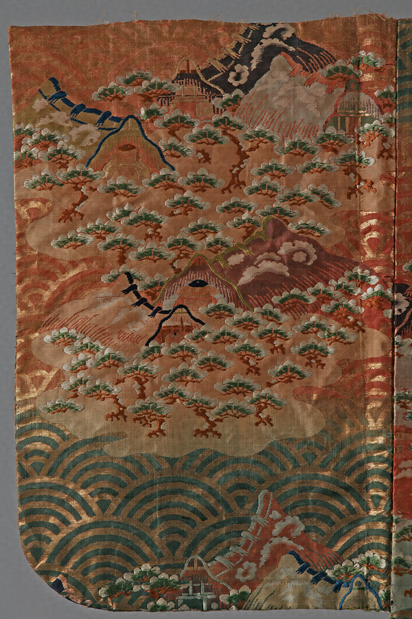 紅萌黄茶段青海波松塩釜模様唐織