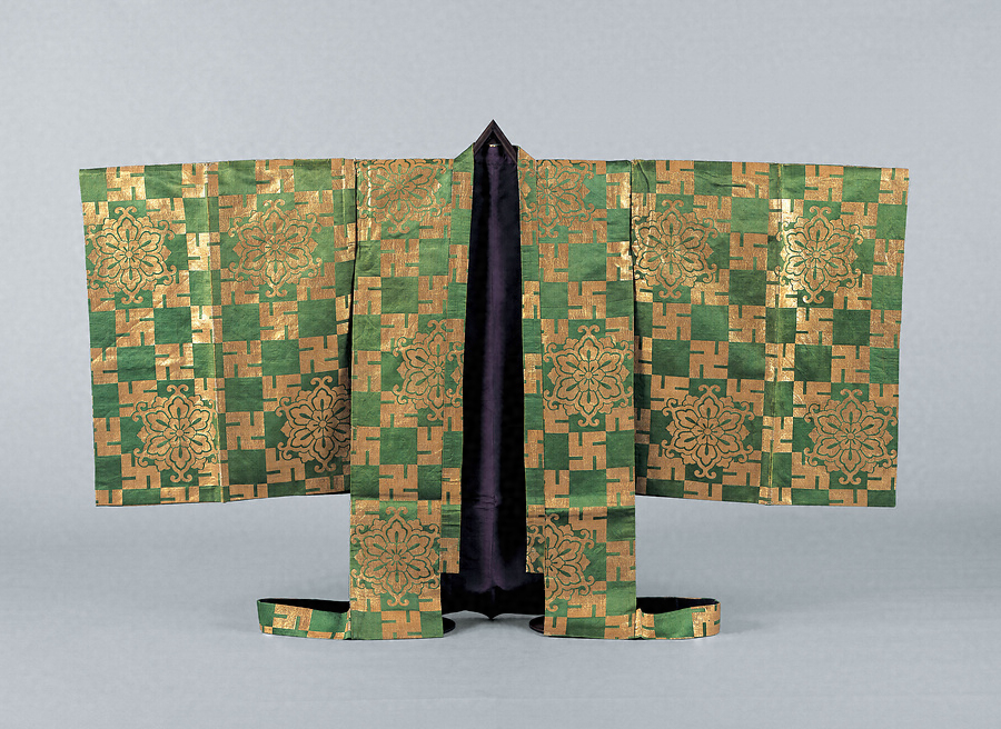 卍文は、インドでビシュヌ神の胸毛より起こった吉祥のしるしで、仏菩薩の胸・手・足などに現れた吉祥・万徳の相を示す。日本や中国では釈迦の象徴と考えられていた。図形には向きによって2種類があり、活字の卍とは逆向きの右卍と呼ばれる形が原形とされ、卍は左卍になる。この装束でも、よく見ると、左卍文と右卍文を1段ずつ交互に配置している。