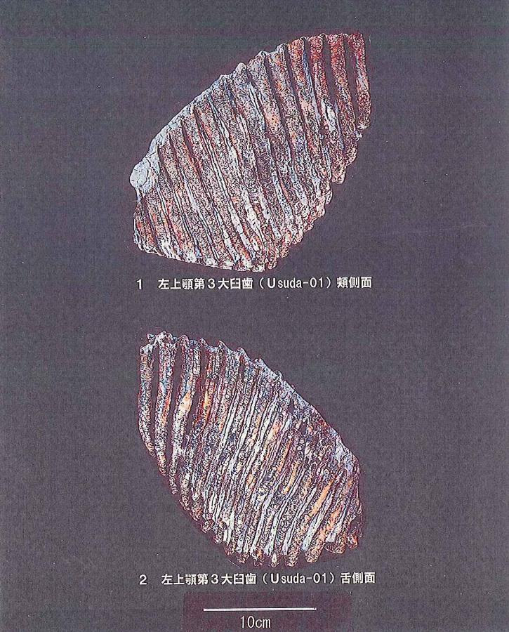 発見された化石の概要(1)左上顎第3大臼歯・・ほぼ完全な保存の良い標本であり、長さ254㎜、幅86㎜を計測する。(2)左下顎第3大臼歯・・4つの破片が発見されている。直接には接合しないが、すべて同一の左下顎第3大臼歯の破片であると考えられる。長さは79㎜・88㎜・52㎜・10㎜、幅は78㎜・79㎜・49㎜・41㎜を計測する。(3)切歯片(牙)・・主なもの10点の他、小片が多数発見されている。現存する最大長は、172㎜~67㎜、最大径は110㎜~24㎜を計測する。