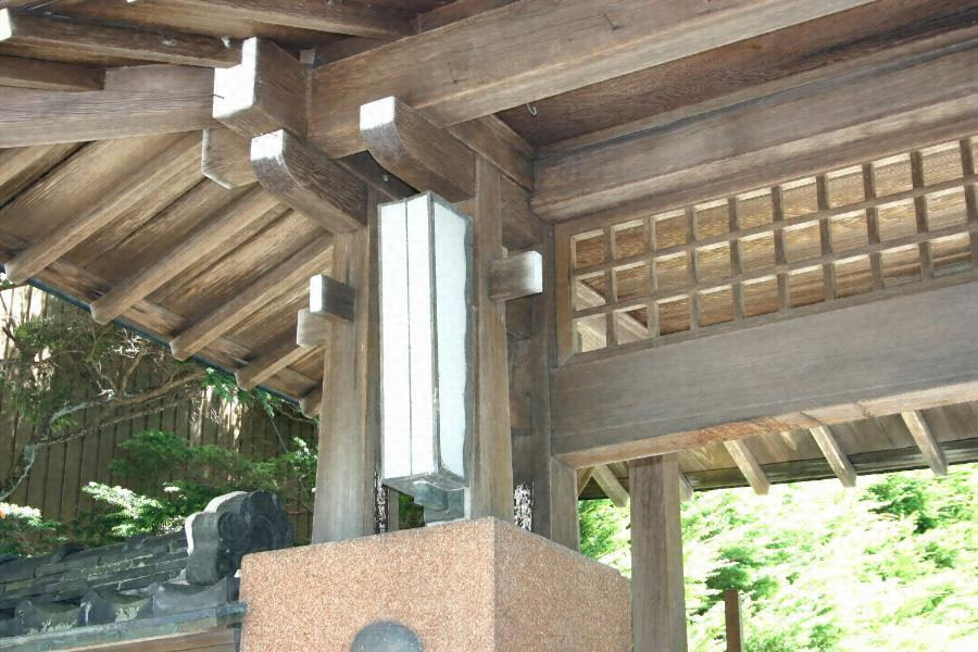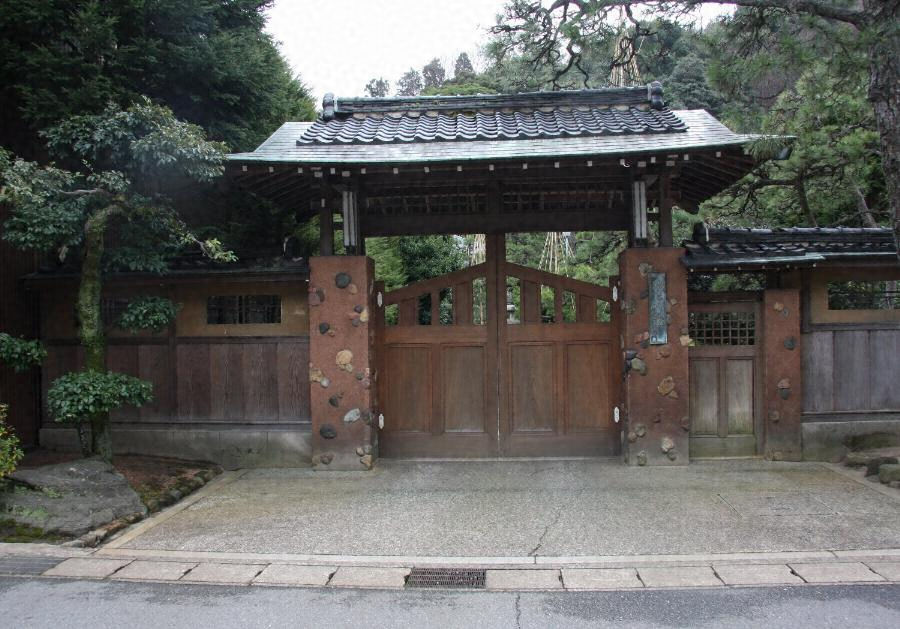敷地北に道路に面して建つ。薬医門形式の入母屋造桟瓦葺で軒先を銅板葺とする。太いコンクリート造の本柱と脇柱の表面を、赤錆色の砂利の洗出し仕上げとして玉石を散らして埋込み、その上に立てた細い柱で軒を支える。独創的な意匠を見せる、老舗旅館の表門。