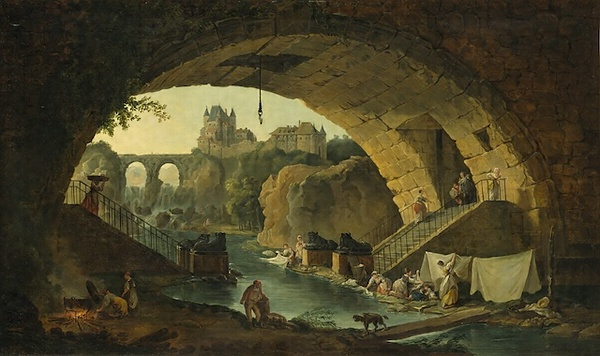 古代風の建物や廃墟を主題に描いたロマン主義風景画や、18世紀後半のパリの生活や出来事を描きとめた記録画を得意としたユベール・ロベールは、1754年から65年までローマに滞在した。この期間に、「廃墟の画家」として知られるピラネージやパニーニと知り合っている。ロベールが古代の建築やモニュメントを同時代のモチーフと組み合わせて描くスタイルはこのローマ滞在に影響を受けている。本作の画面の前景では、川にかかる石橋のアーチの下で、女たちが洗濯や炊事に余念がない。スフィンクス型の2対のライオン像が置かれた石の階段を上り降りする人々、母親の傍で戯れる子どもたち、両岸に渡された板の上を歩く犬など、日常のありふれた生活のひとコマが描き出されている。一方、対岸の左下方は反対に暗くなっていて、薪を焚く炎の黄色い明るさが周囲の暗さを強調する格好になっている。川面に沿って上流の方向に眼を向けると、遠景には二つのアーチをもつ石橋の下に滝のような急流があり、ごつごつとした大きな岩の間をぬって下り落ちているのが見える。繁みのある岩場の上には古城がそびえ立っている。近景の現実的な生活空間とは対照的なロマン主義風の非現実な空間ともいえる光景で、明るい幻を見ているような印象を受ける。すなわちこの作品は、近景では当時の庶民の生活風景を、遠景では橋と城のあるロマン主義的な風景を表わしており、その両者を一つの画面に組み合わせて描いた彼の得意のスタイルといえるだろう。ロベールはローマから戻った後、本作が描かれた1767年には王立絵画彫刻アカデミーに入会し、その後も宮殿の装飾などを手がけて活躍した。