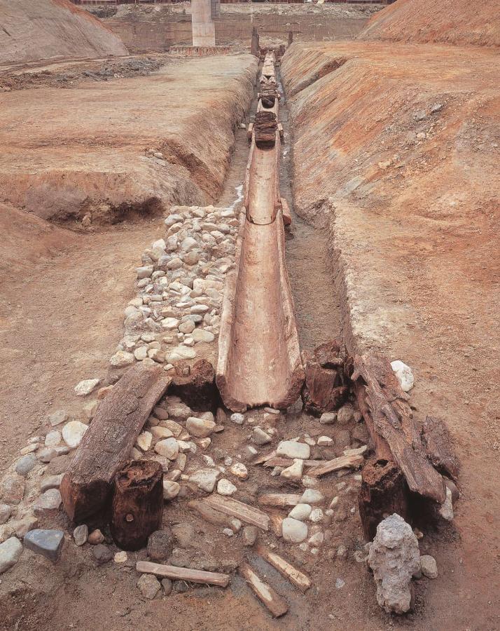 狭山池は,飛鳥時代に築造された灌漑用の溜め池である。大阪府南部の大阪狭山市の中央部に位置し,丘陵間の谷を堰き止め築造された。狭山池の改修に関わる確実な記録は8世紀以降であり,奈良時代の行基(ぎょうき),鎌倉時代初頭の重源(ちょうげん),慶長13年(1608)の片桐且元(かたぎりかつもと)の改修等が知られる。近代以後も継続して利用され,大正末年・昭和初年(1926)及び昭和63年(1988)から平成14年(2002)の二度の改修を経て,現在に至った。平成の改修に伴う発掘調査の結果,敷葉(しきは)工法による飛鳥時代及び奈良時代の堤や,鎌倉時代から近世・近現代までの盛土等を検出し,堤断面(つつみだんめん)層序(そうじょ)と出土木樋(もくひ)等の遺物,文献から改修の履歴が判明した。特に下層東樋(ひがしひ)の木樋(もくひ)は推古天皇24年(616)の伐採と判明し,狭山池築造が飛鳥時代に遡ることが確実となった。また,重源狭山池改修碑(ちょうげんさやまいけかいしゅうひ)も出土している。このように,狭山池は,飛鳥時代に築造され,その後各時代の改修を経ながら今日まで利用が継続している灌漑用溜め池である。発掘調査によって築造の工法,歴史的変遷も明らかとなり,飛鳥時代の木樋(もくひ)をはじめとする貴重な遺物も出土した。我が国古代以来の土木技術の歴史を理解する上で重要である。
