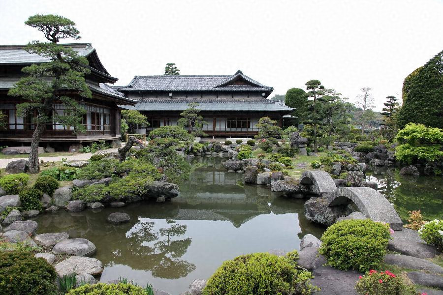 庭園は,玄関前の表庭,主庭,3か所の中庭,裏庭の六つの空間から成る。主庭は園池を中心とし,中島・枯滝(かれたき)石組・築山などを設け,随所に飛び石を打つ。また山燈籠(やまどうろう)などの石燈籠を各所に配置するほか,クロマツ・イヌマキ・カエデ類などの高木,ツツジ類などの低木を植えている。また園池北西部には枯流れなどが造られている。