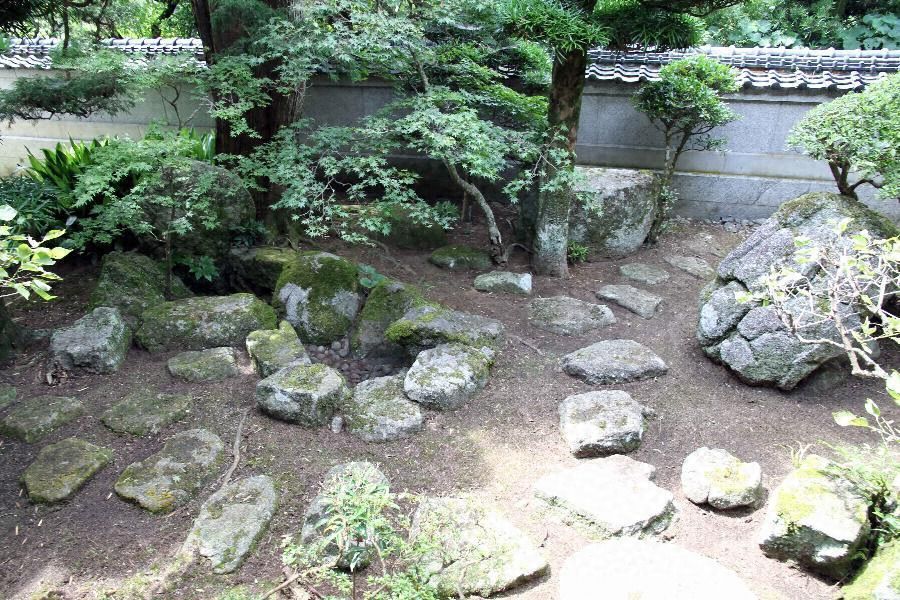 三つある中庭は,自然石の水汲み場を設け,六角燈籠,飛び石などを配置するもの,短冊形に加工した石を縦に2列に敷き並べて通路とし,分岐点に円形の切石を用いるものなど,多彩な意匠を特徴とする。