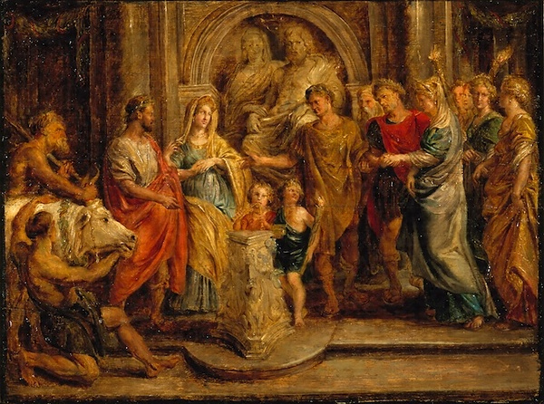 ルーベンスはフランス国王ルイ13世の母の生涯をテーマとした油彩画の契約のため1622年初頭にパリに赴く。しかしパリから戻るとすぐに新しい仕事である《コンスタンティヌス大帝の生涯》をテーマとした大きなタペストリー連作にも取りかかった。本作品は、そのシリーズの最初の下絵である。ルーベンスは装飾的な大作に取り組む際には当初のスケッチと仕上げのみを手掛け、ほとんどを助手に任せた。その意味でも本作のような油彩画による下絵はルーベンス芸術の重要な側面を担っているといえよう。ここには2組の結婚式の模様が描かれている。1組はローマ皇帝コンスタンティヌス1世[大帝]とファウスタ、もう1組はコンスタンティヌスの妹コンスタンティアとローマ皇帝リキニウスである。しかし、実際には、これらの結婚式はそれぞれ307年と313年に行われた。ルーベンスがこれらの別々の結婚式を同一の場面に描いたのは、1614年の重要な2組の結婚式の意義を古代の英雄の事績と重ね合わせて象徴させるためであった。それはフランス国王ルイ13世とオーストリア王女アンヌ・ドートリッシュの結婚式と、スペイン国王フェリペ4世とフランス王女エリザベトの結婚式である。このように古代の人物と当代(ここでは17世紀)の人物とを取り合わせたりすることは、絵画の表現手法としてよく行われた。画面には、男女の彫刻を背景に小祭壇が置かれ、古代風の装飾が強調される。画面の中央では2人の子どもがこの神聖な場面に活気を与えている。1人はアウロス(古代ギリシアのオーボエ系のダブルリード楽器)を吹き、1人はたいまつを手に持っている。この子どもたちは、結婚する2組の人物を結ぶ役割を果たしている。左隅には、生贄の牛が見える。本作のように下絵として描かれた油彩画においては、画家の構想・アイデアが実に巧みに素早い筆さばきで画面に描き留められており、ルーベンスの偉大な素描画家としての才能をつぶさに見ることができる。躍動的で伸びやかな筆致、手早いながらも表情や衣服に光の流れを与えるほんのりとした色調、重ね合わせられた複雑な要素をまとめあげる構成の巧みさ。フランドル最大の巨匠の熟練した技術は、生き生きとした躍動感、感情をも画面に描き出している。