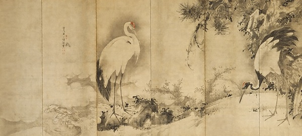 曾我蕭白による墨画淡彩で描かれた六曲一双屏風のうちの左隻。右隻の所在は明らかでない。蕭白は江戸時代にみられる厳しい道徳社会からは独立し、比較的自由奔放な生活をしていた。二羽の鶴は松、波、そして岩のダイナミックな背景に優雅な姿で立ち、墨画による明暗の色調が、画面の構成に一層の深みを与えている。