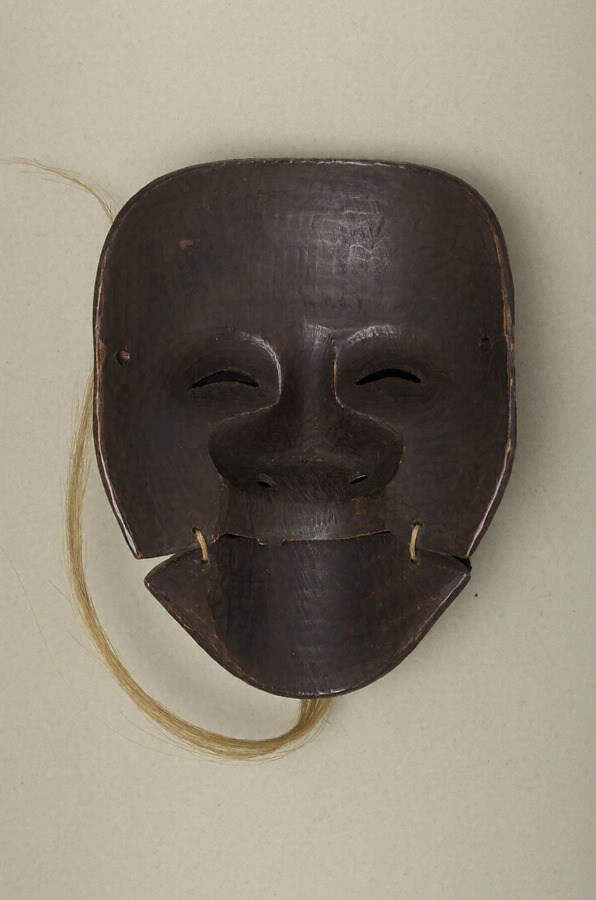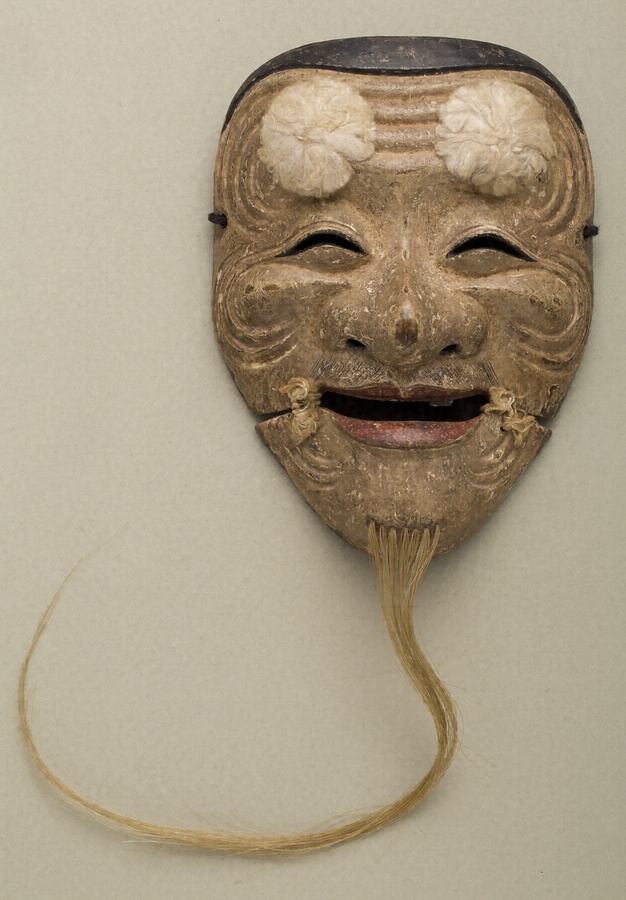 「白色尉」は〈翁(式三番)〉で、大夫が天下泰平・国土安穏を祈って舞う時に用い、「翁面」とも呼ばれる。「翁面」は本来、各地の神社に御神体として祀られていたもので、大夫は「翁面」を掛けることにより神となる。この面は金剛宗家が所蔵する伝日光作の白色尉と同系で、笑みを湛えた口元、豊かなボウボウ眉、長く延びた顎髭など、とても華やかな印象を受ける。面裏は刀目を少し残して平らに仕上げ、拭漆を施される。面袋は白繻子地に紫糸の刺繍で「翁 日光写」と記す。