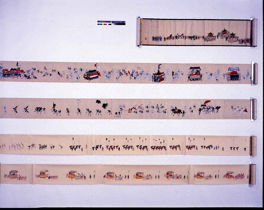 高松松平家10代藩主頼胤の兄、松平頼該(金岳・左近)筆。上巻は城下の各町から出されたお船や趣向を凝らしたつくり物を載せた囃子屋台などが描かれ、下巻は鳥毛や挟箱などの奴行列やオサキラサン(頭人)、神輿などを描く。
