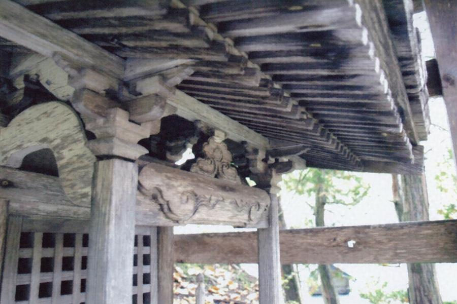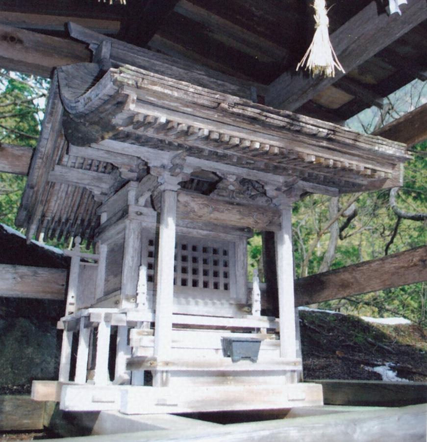 田村薬師堂の西に位置する。陰刻のある巨大な岩の上に鎮座する小祠。土台上に建つ1間社流造、こけら葺。身舎は円柱で貫や長押で固め、台輪上に三斗を組む。妻は虹梁大瓶束で、二軒繁垂木。庇は几帳面取方柱、三斗組。丁寧に仕上げられた小規模社殿。