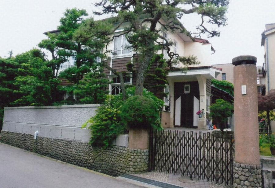 敷地東面北端に開く門で、北側門柱は高さ二・九メートルの円柱で基部は玉石張、胴部はモルタル塗で円盤が載る。南側門柱は植木鉢とする。門から南へ延びる塀はコンクリート擁壁に玉石張で、片端波形のコンクリートブロックを一段積み、南面東半まで廻らす。