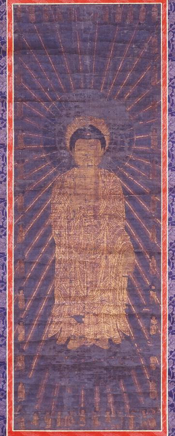 「方便法身尊像」と呼ばれる中世後期の浄土真宗が生み出した独自の尊像で、蓮華座上に直立し、48条の光明が覆う阿弥陀如来を正面向きに描いたもので、光明の外縁に上下左右に12体ずつ、合計48体の蓮華座上に直立した化仏を配している。画絹の目がきわめて粗く、やや発色を抑えた太めの切金を使用し、阿弥陀如来の体のバランスがよく、目鼻立ちが整っていることから、室町時代後期、15世紀末から16世紀前半頃と考えられる。