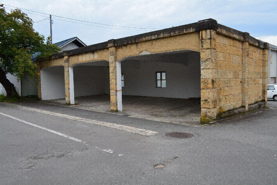 本屋の正面側広場にある自動車修繕庫。陸屋根の鉄筋コンクリート造であるが、外壁は全て高畠石張として本屋と調和させている。正面側は柱ニ本を立てて大きく開口を取り、背面側には窓三箇所を設ける。地方私鉄の駅前景観を今に伝えている。