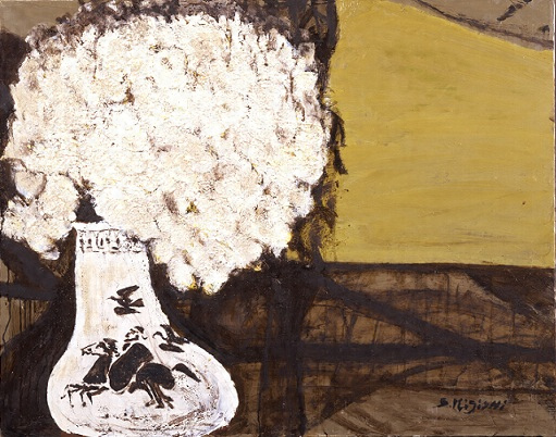 清新な印象を感じさせるやわらかな白い花が、緑と褐色の落ち着いた色調を背景に咲き誇る。湧き立つような花びらが生き生きと描かれ、画面いっぱいに清々しい香りを放っている。情熱的な赤い花の作品が知られる作者であるが、意外にも白の花を好み、多く描いている。「私は白い花が一番好きである。白い花にわが生命をこめる。その時の様々な心の動きをこめて描く。悲しいとき、生きているのが堪えられぬとき、生命のぎりぎりのとき、白い花を描く。」(「花譜12ヶ月 2月 白い花」『未完の花』) 切り詰めた色使いや、緑の色面を切り取る黒のシャープは線からは、この絵を描いている時の作者の緊張感や厳しさが伝わってくるようである。花瓶には馬に乗る中国風の人物と2羽の鳥が描かれ、全体の色使いと相俟って東洋的な雰囲気を漂わせている。