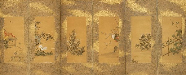 六曲一隻の 風で右から「隠元」「龍図」「白梅に紅白椿」「紅白の萩」「笹に鉄線」「蔦」の各図を配する。右の3図では絵を右寄りに描き、左の3図は左寄りに描いており、左右対称となるように配慮されている。いずれの絵も淡彩を用い、余白を生かして柔らかな描線で描かれており、琳派らしい装飾性に富んだ優雅な作品となっている。「宗雪」の印章を各扇に押すが、作風は相説の特色をそなえている。相説も一時期「宗雪」印を使用したことから相説あるいはその周辺の画家の手になると考えられる。喜多川相説は、宗達、宗雪のあと、17世紀後半に活躍した画家で、草花図を主体に描き、光琳をはじめ後の琳派の画家たちの草花図に大きな影響を与えた画家である。