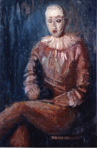 サーカスの人気者として注目を浴びるイメージとは裏腹に、ここに描かれているのは、舞台での剽軽なしぐさは影をひそめ、マスクを外して静かに休息する道化の姿。そこには深い憂愁が漂っている。人前ではつねに陽気に振る舞い、巧みな弁舌で決して人を飽きさせることがなかったという三岸の別の一面がこうした道化の姿に託されていたのかもしれない。