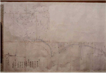 「開成丸航路図」開成丸は陶工三浦乾也が、仙台藩の命により寒風沢で建造した。長さ11丈、巾2丈5尺、二檣の帆船である。三浦乾也は、西洋型船建造の命を受けると長崎におもむいて研究し、帰国後苦心をかさねて安政5年(1858)にこれを完成した。開成丸の運航成績はきわめて良好であったといわれている。この航海図は、江戸回航のため安政6年2月12日昼寒風沢を出帆し、同17日夕刻浦賀に入港するまでの航跡を詳細に記録したものであり、乗船していた測量方等により浦賀入港後作成された。
