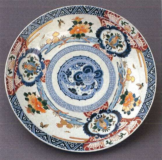 中央に龍、周りにザクロと椿を配置。染付の上から色絵と金をかぶせる染錦(そめにしき)という技法を用いる。文化元年(1804)の箱書き銘がある。中野区内旧家の伝世品。