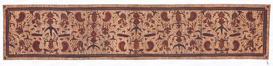 胸布あるいは肩掛け。手描きの蝋防染め(バティック)で抽象的な花鳥模様、片翼模様を表す。バティックはインドネシアのジャワ島を中心に制作される蝋防染による模様染又はその製品を指し、日本では「ジャワ更紗」とも呼ばれる。インドの影響を受けながらも独自の展開をみせた地域的特色が豊かなバティックは、2009年にユネスコの世界無形文化遺産に認定された。旧カネボウコレクション 1211.66
