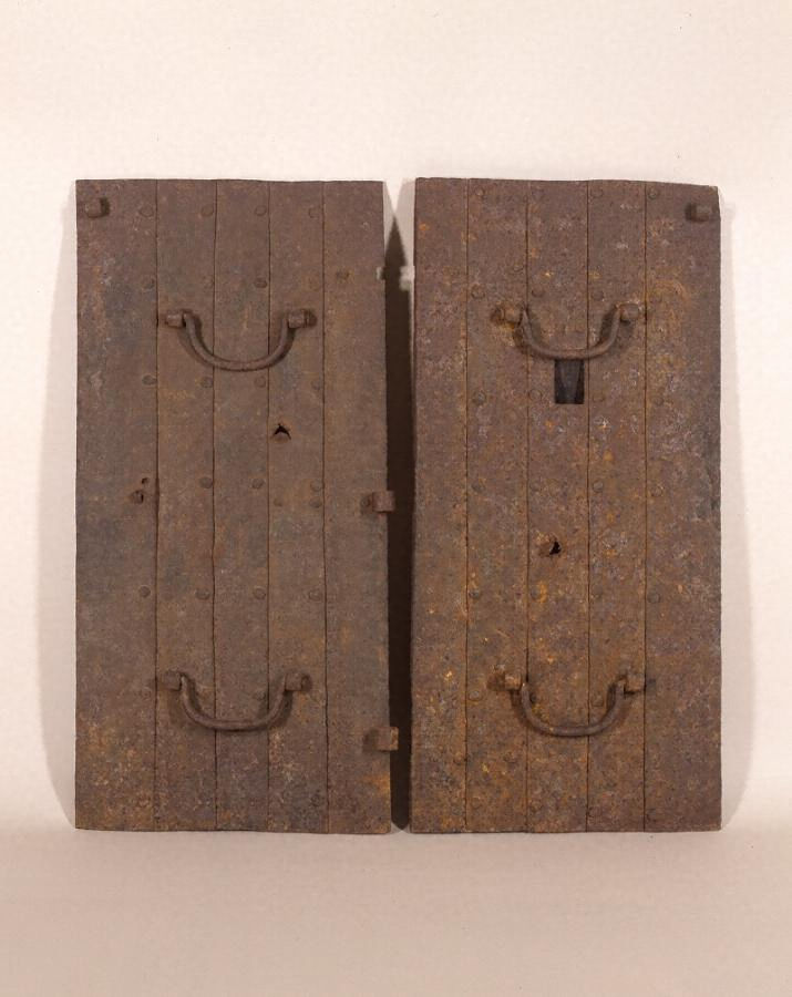 大阪の陣で使用したと伝えられる鉄製盾。 鉄盾一体は、横44㎝、縦91㎝で、横11.5㎝、縦91㎝の細長い鉄板五枚を鋲で留めたものである。その重量は15kgで、一対で30kgになる。一体の上と下の部分に、対になって取っ手が取り付けられており、一対で合計四ヶ所に取っ手があることになる。また、一対の片方には、ふたのついた小さなのぞき窓が設けられている。利用に際しては、それぞれの盾をしっかりした蝶番でつなぐことによって、二枚一組の大きな鉄盾となる。盾のところどころに深さの様々に異なるくぼみや、弾が貫通して割れたと思われる穴が残されていて、実際に激しい戦闘での使用があったものと考えられる。