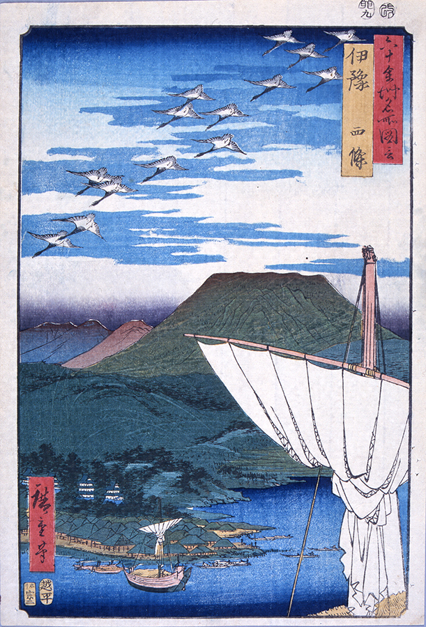 画面中央に四国最高峰の石鎚山を置き、その麓には西条藩松平氏3万石の陣屋町西条、右手前に白帆をまきあげた廻船を配している。本資料は淵上旭江の『山水奇観』より図柄を借用しているが、近景に廻船の帆を大きく描き込むなど、広重の工夫の跡が見える。画面上では城郭が描かれているが、実際には西条藩では城郭は作られず陣屋であった。