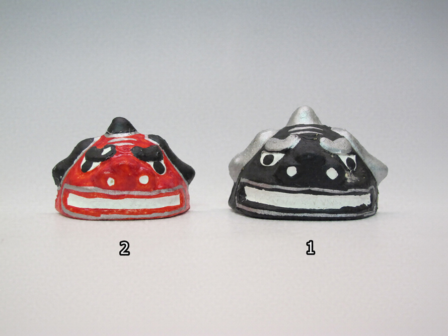 祭礼に使われる木製の獅子頭をもとに玩具化した土製の小型獅子頭2点である。いずれも角1本を持ち、目は大きく開いている。黒獅子は毛と角の部分を銀に、赤獅子は黒に彩色されている。赤獅子は黒獅子より少し小さい。