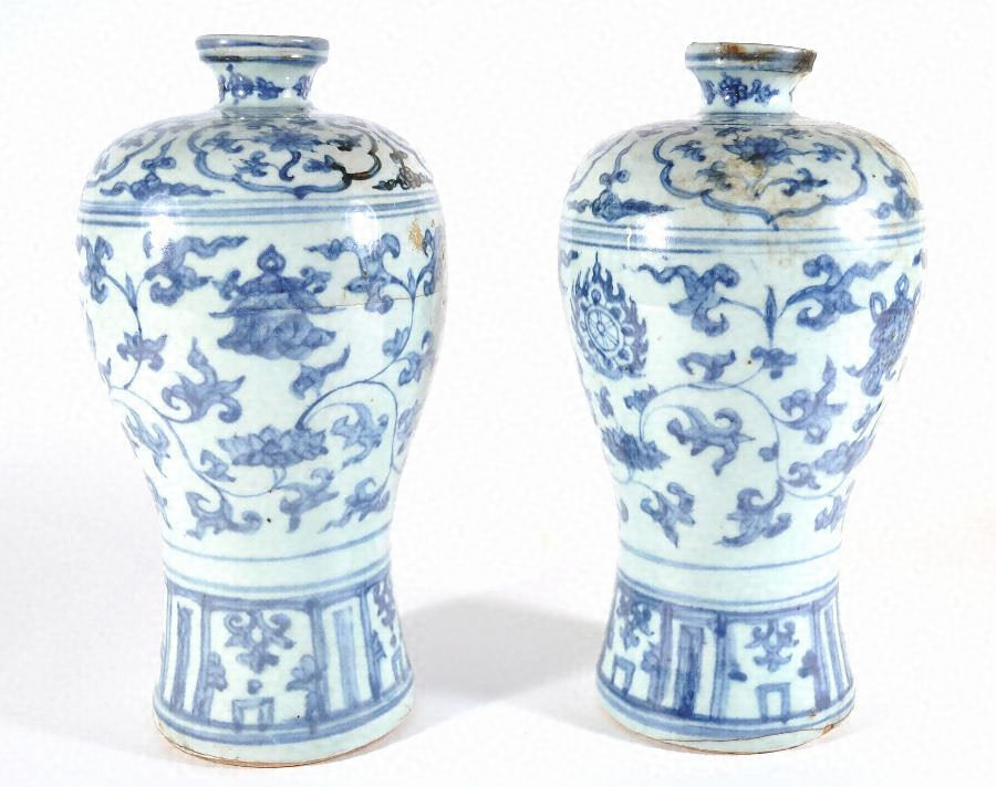 青花磁器瓶:①口径4.9cm、底径10.75cm、器高27cm、胴部最大径14cm②口径4.65cm、底径10.7cm、器高26.6cm、胴部最大径14.4cm。