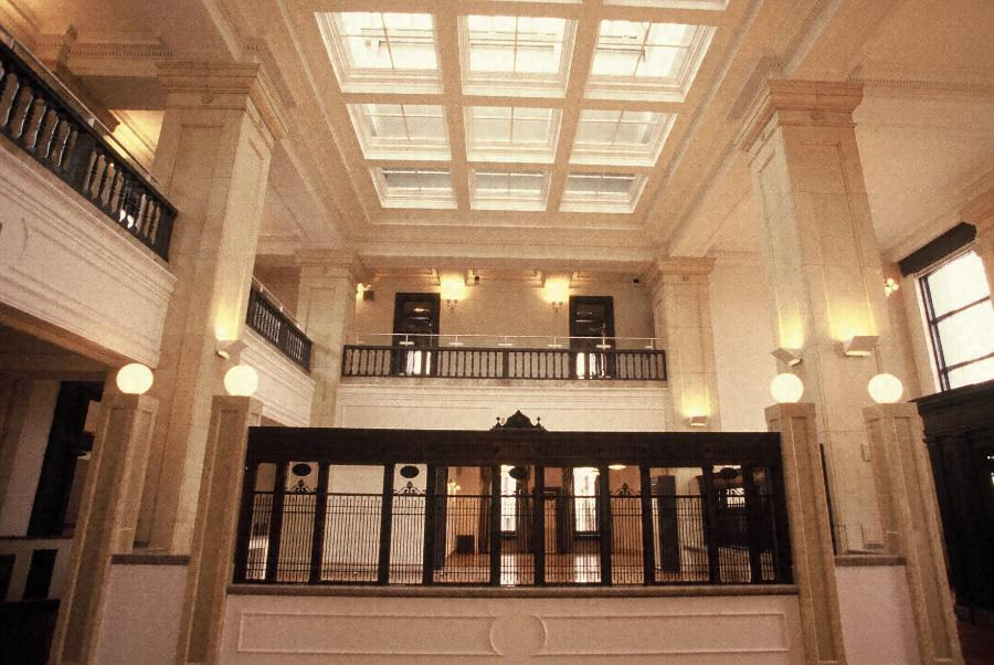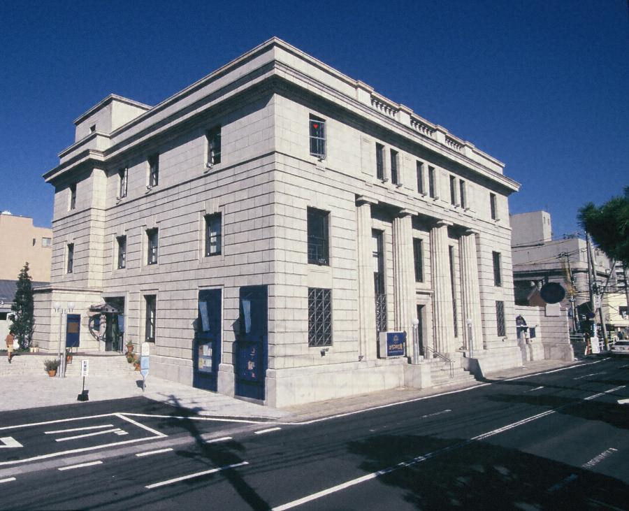 長野宇平治の設計で昭和一三年に完成した。鉄筋コンクリート造三階建、地下一階で、塔屋と煙突を有する。外観はギリシャ神殿風の意匠でまとめ、営業室と客溜は吹き抜けの大空間で、地下は金庫室である。当初形式をよく保持し、地域の核として親しまれている。