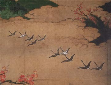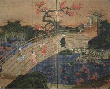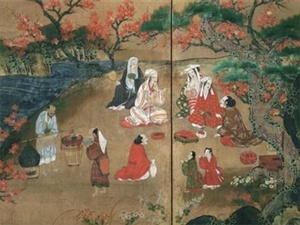 高尾清滝川のほとりで紅葉を楽しむ武士,僧侶,婦女子等を描く。背景は右方に神護寺をのぞみ,左方では愛宕山の雪が冬の訪れを告げる。画面左端に「秀頼」壺印がある。狩野派による近世初期風俗画の早期遺例として貴重である。