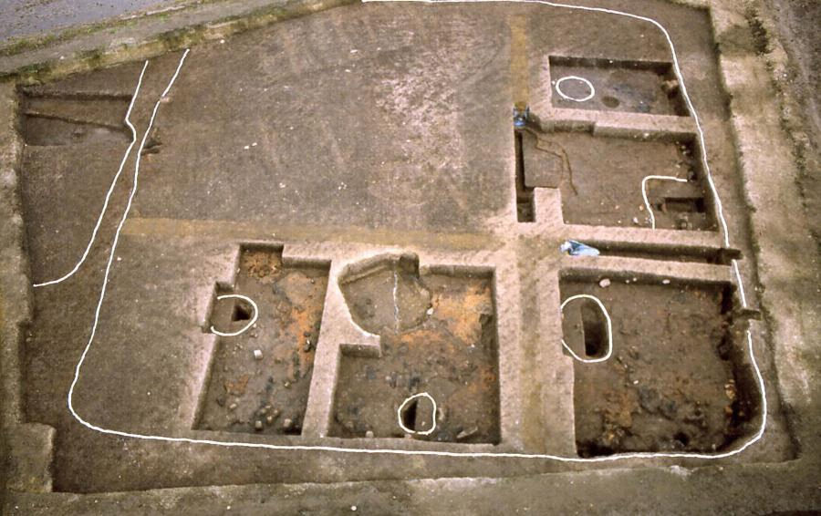 遺跡の北側と東側では溝が,南側には川の跡があり,集落域を区画したとみられる。集落域の東側では弥生時代後期中葉と考えられる,周囲に焼成(しょうせい)された壁材が施され,床面は貼床(はりゆか)の上に質の良い粘土を貼り,焼き締められたという,国内に例のない大型竪穴建物(たてあなたてもの)が発見されている。後期中葉には大型掘立柱(ほったてばしら)建物3棟(①桁行(けたゆき)4間・梁行(はりゆき)2間,②桁行5間・梁行1間,③桁行3間・梁行1間)がL字状に配置され,さらにそれを区画する柵が確認されている。その周囲からも大型掘立柱建物が弧状(こじょう)に配置された状態で発見されている。後期後葉にも大型掘立柱建物が,弥生時代終末期から古墳時代前期初頭には竪穴建物が確認されている。