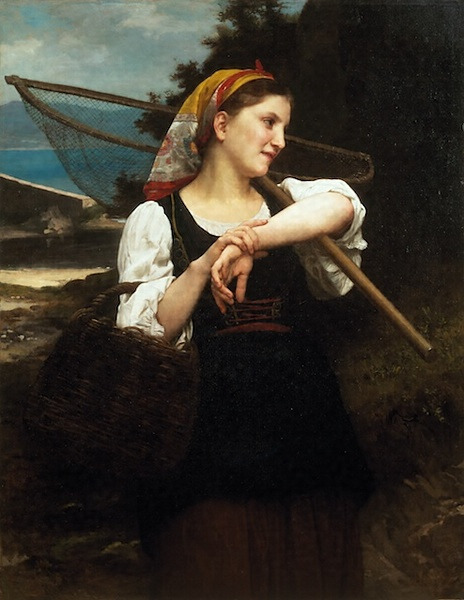 19世紀後半のフランスは、美術の世界でも官展に対抗して印象派が第1回展を開く(1874年)など、新しい時代への転換に向かって、地殻変動が起きた時代であった。しかし正統派を自認するアカデミズムの勢力は健在であった。 アレクサンドル・カバネルとともに、この時代のアカデミズム絵画を代表する画家であるウィリアム・ブーグローは、マネや印象派の画家たちの絵画を拒否した保守派の人物としても有名で、“ブーグロー風”という言葉が印象主義の反意語として用いられもした。彼は新古典主義の画家ピコの弟子で、1850年にローマ賞を受賞、歴史画や神話画の大作をサロンに出品している。微妙な明暗まで再現する精緻な描写と磨きあげられたマティエールが際立つその様式は、アカデミックな写実技法の極致といえる。 一方、ブーグローは風俗画も数多く制作した。1870年代以降は、愛情あふれる母子、牧歌的な風景に愛らしい少女といった定型化した作品を数多く制作するようになった。本作はこのような時期に描かれた牧歌的少女像のひとつである。網を左肩に担ぎ、籠を右手に抱えてポーズする漁村の若い娘。海辺の場所や着衣などは地味で、頭に被ったスカーフの色と模様がこの絵で唯一の華やかな部分である。それゆえに顔や首すじ、腕や手といった露出した肌の部分の生々しさ、また磁器のように滑らかでみずみずしい描写に、自然と見る者の目は導かれる。ある意味で写真的ともいえる人体の描写は、ブーグロー特有の表現法でもある。