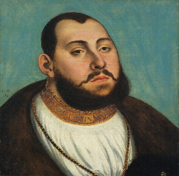 クラーナハはアルトドルファーらと並ぶドナウ派の巨匠で、1505年にザクセン選帝侯フリードリヒ賢侯に招かれてヴィッテンベルクの宮廷画家となり、肖像画や祭壇画を制作している。3代にわたるザクセン選帝侯に仕え絵を描いたが、ここに描かれたのはクラーナハが最後まで忠誠を誓った3代目のヨハン・フリードリヒ豪胆公(在位1532―47年)の若き日の気力に満ちた肖像である。作者の高い写実の技術、深い心理描写など、鋭い眼によって、モデルの男性的で特異な風貌や豪放な性格がよく映し出されている。この右向きの半身像は、もと二連式絵画(ディプティク)の左側の一部分であったと思われる。