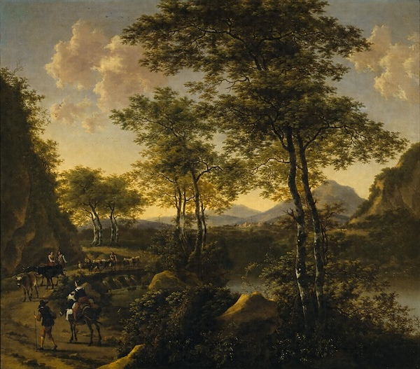 ウィルム・デ・ヘゥスは17世紀オランダの画家ヤン・ボト(1615頃―1652)の弟子であったと考えられており、師の作風を忠実に守った画家である。本作に描かれた構図や主題を理解するためには、ヤン・ボトの様式を解読することが必要であろう。ヤン・ボトはイタリア、ローマ平原の空想的な、または現実の景観を背景として描いた一群のオランダ人画家のリーダーで、その画面上には牛を追う農夫や、夕陽に映えるローマの廃墟を眺める旅人が登場する。本作は、このボトの描く風景の生き写しで、樹木、植物、岩、急流、その上に架かる橋、山道を往く旅人(ここでは赤ん坊を抱いた若い母親がロバに乗り、その傍らをその夫と覚しき男性が歩いている)、牛と山羊を追う牧童たち、遠くの廃墟など、画面に登場すべき〈要素〉がすべて盛り込まれている。ここにはアルプス以北の国々の画家たちが理想とした、南の国イタリアの明るい陽光と牧歌的な詩情あふれる風景への憧憬が託されているのである。