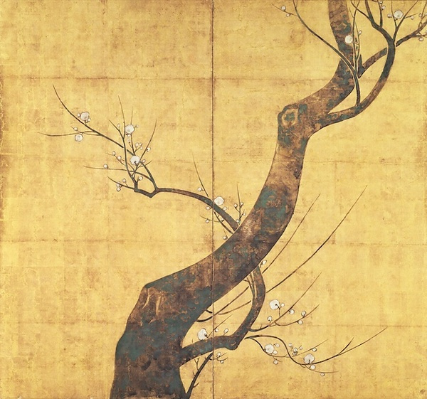 琳派は桃山時代後期に興った流派で、本阿弥光悦と俵屋宗達が創始し、尾形光琳・乾山兄弟によって発展した。当時衰退気味であったやまと絵の伝統を装飾性豊かな独特の様式美によって再興し、宮廷や上層町衆を中心として広く受け入れられるところとなり、以後の日本美術に多大な影響を与えた。本作は、しなやかに枝を伸ばし、枝先の白梅の蕾がちらほらと咲きだした梅樹を、金箔の無地を背景に対角線状に大きく描いた琳派らしい装飾性の高い作品である。樹木としての生態の描写を度外視して、梅樹は根元や上方を画面の外にはずし、枝振りや幹の一部のみを描いて梅樹独特の形態の美しさを抽象化し、無駄なく簡潔にまとめあげた構成力は見事というほかはない。広く残された金地の輝きが豪華な雰囲気を醸し出し、薄墨のたらし込みであらわされた樹幹に点苔として加えられた緑青が潤いを感じさせて美しい。太い幹が右上方向に伸びるのと対照的に、右に分かれた枝が左上に向かって枝を伸ばす構図の妙に加え、伸びやかな枝振りは気品さえ感じられる。工芸的な意匠性とともに品格に富んだ琳派ならではの典型作の一つといえよう。
