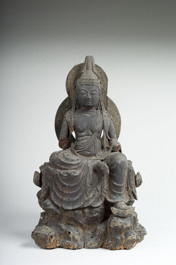 桜を代用材として用いた檀像。左足を垂下して岩座に坐る姿から石山寺本尊の模像とみられ憂いを帯び表情にも天平後期彫刻を意識した風がうかがえる。鎬を立てながらも浅く均一に揃えられた衣文などより製作年代は11世紀前半に置かれる。