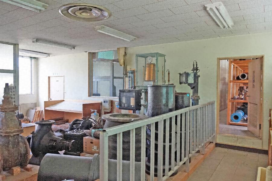 配水地への揚水用ポンプを収容した、間口一四間奥行五間の鉄筋コンクリート造建築。平側に窓を広くとり採光や排気に配慮したつくりで、四周に菱形模様付のパラペットを廻らし、柱形には石積風の目地を刻むなど随所に意匠を施す。水源地の要となる建造物。