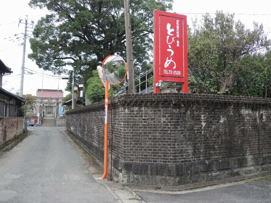 主屋の前庭を囲み、敷地南面に折曲がりにのびる煉瓦塀で総延長八九メートルを測る。江戸切仕上げの花崗岩積基礎の上に鉱滓煉瓦をイギリス積とし、頂部に軒蛇腹三段積と屋根二段積を施す。特に敷地南西隅は円弧状平面として技巧的に仕上げ集落景観に寄与する。