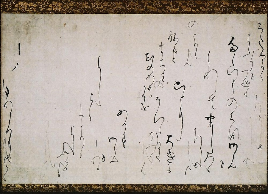 女房奉書風に散らし書きの仮名御消息である。花の風情を賞でられた内容であるが、字配りから見て、断簡か更に礼紙が沿っていたか判然としない。墨の濃淡に意を用いられた美しい筆致が見どころである。