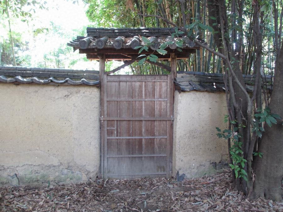中門の西端から北へ延びる庭門と塀。庭門は腕木門で、片開戸を建て込み、上部には折枝を入れ数寄屋風意匠で飾る。庭門の南北に塀が延びる。塀は土塀で、南側が本瓦葺、北側が桟瓦葺と違える。主庭と奥庭を画し、屋敷地内後方の庭園景観を構成する門塀。