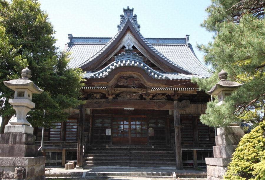 城下町の南端に東面する日蓮宗寺院本堂。桁行五間で、中央間は二間分の間口をもち、広縁・外陣境と外陣・内陣境には直径一・五尺の丸柱を立て虹梁で繋ぐ豪壮な造り。鬼子母神を祀り、細部彫刻にも柘榴を彫る。正面の千鳥破風、向拝の軒唐破風に見応えがある。