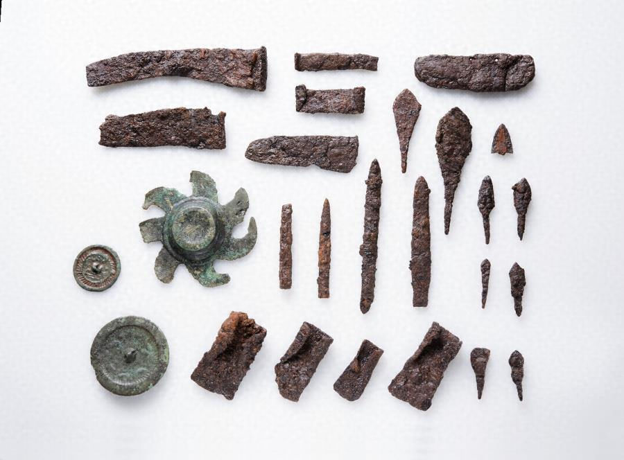 熊本平野北部に所在する、弥生時代後期~古墳時代初頭の大規模な集落跡からの出土品一括。家形土器や、他地域の影響を受けた土器をはじめ、石杵(いしぎね)など赤色顔料(ベンガラ)の調整に使用された道具や、石庖丁形(いしぼうちょうがた)鉄器など多数の鉄製品の出土が特徴。