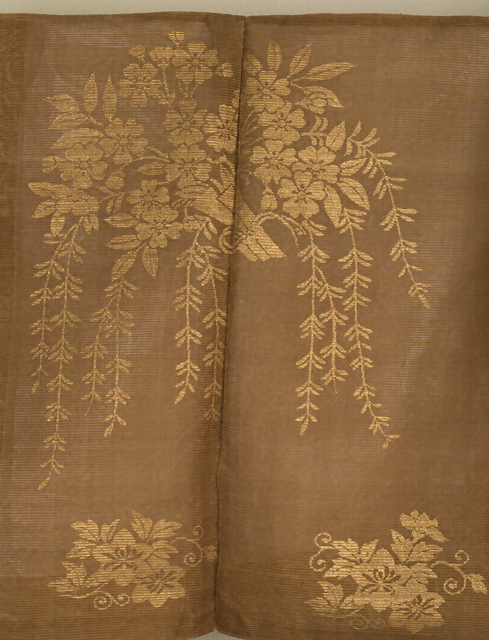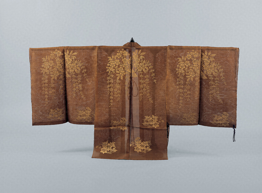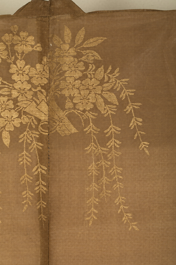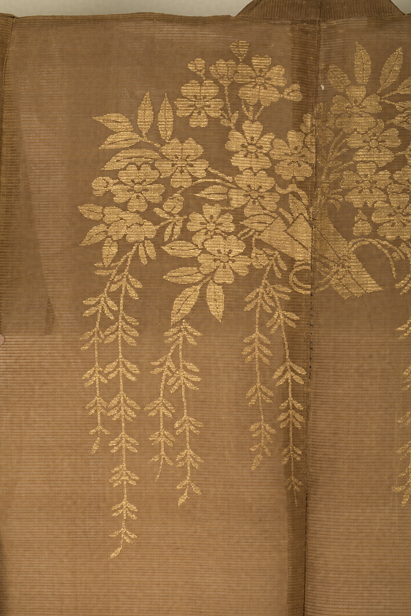 樺色絽地に金糸で織表した長絹で、背・両袖・両胸に枝垂桜の花熨斗文を、裾に鉄線花を散した、長絹である。