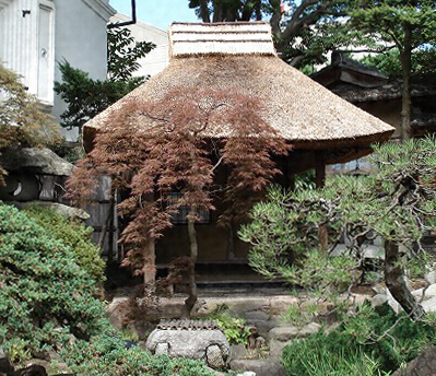 日本館の北に広がる庭園の西北隅に位置し、池を向いて建つ。木造平屋建、桁行2.1メートル、梁間2.0メートル、寄棟造茅葺。柱は磨丸太で、西側面後寄りから背面にかけて土壁を設け、腰掛を付設する。土蔵を背景に従えて、庭園に彩りを添える瀟洒な四阿。