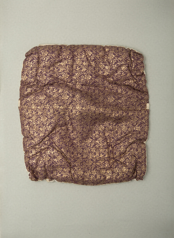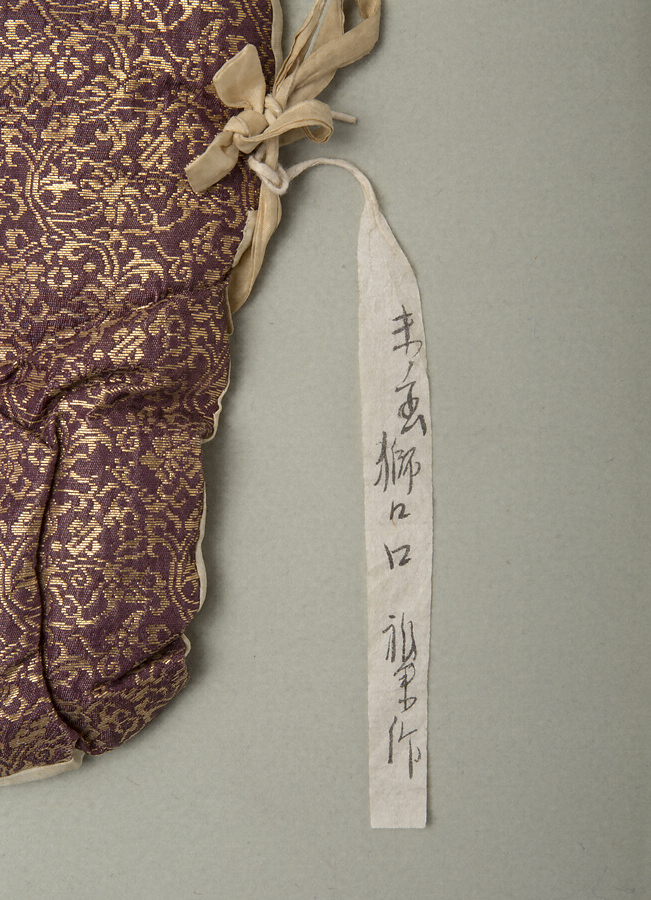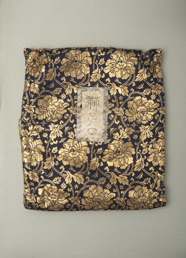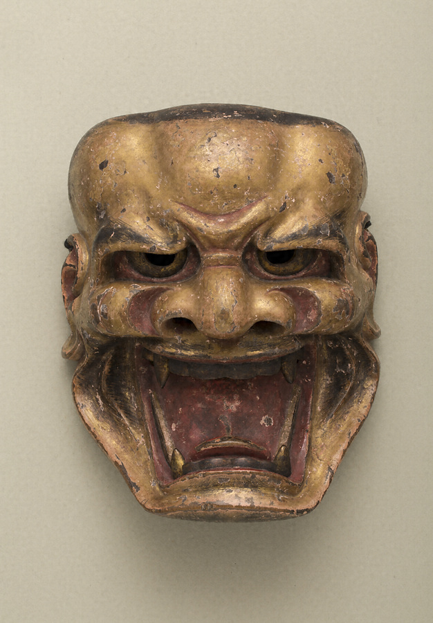 獅子は唐の清涼山に現れ、牡丹の花に戯れ舞い遊ぶ。ダイナミックで左右不均衡な造形と、それを生かす薄手の彩色。上塗りの金色の美しさにも、経年の味わいが滲み、勇壮果敢な獅子王を表現している。宝生宗家所持の型である。裏は、勢いのある刀目を残して仕上げ、拭漆を施す。面袋は面に相応しく、紺地に牡丹唐草模様の金襴で作られ、大切に受け継がれてきたことを感じさせる。