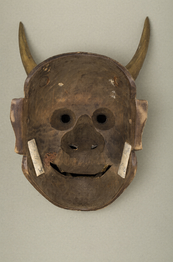 「般若」の面は嫉妬や執心ゆえの激しい怒りの形相を表す。目と歯牙に施した金色が強く光り、額にかかる毛描きも大きく乱れて怨霊性を際立たせている。般若は彩色により、白系、赤系、黒系があり、曲趣に応じて使い分けるが、白い般若は能〈葵上〉など、上臈の役に相応しいといわれる。
