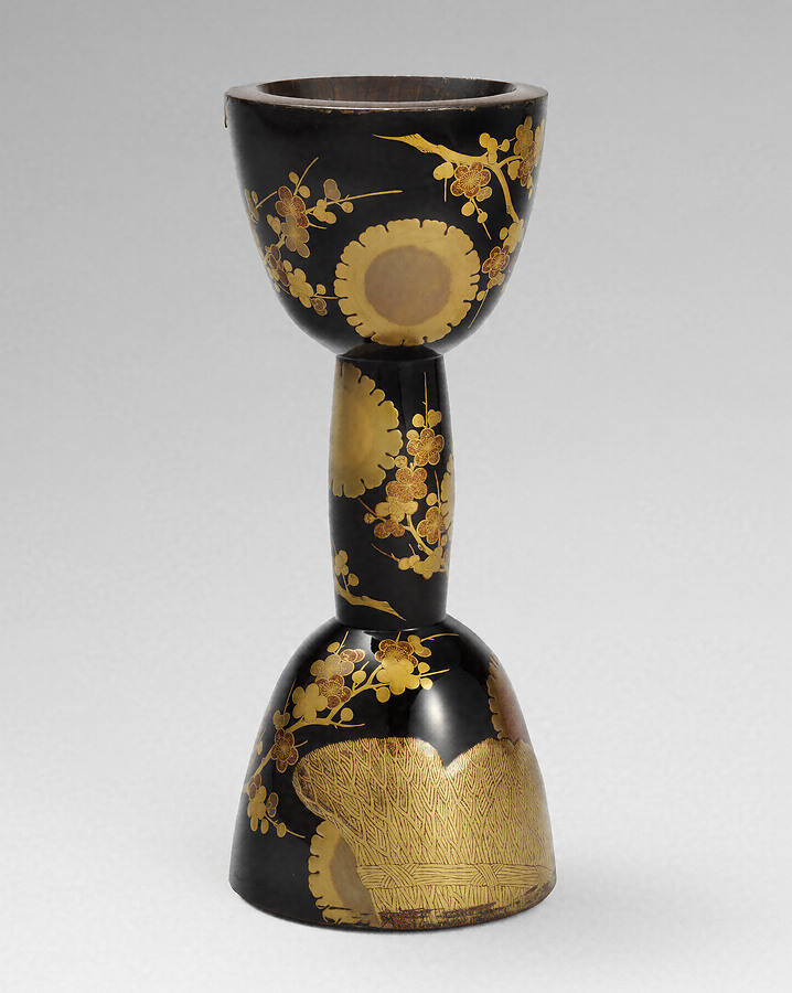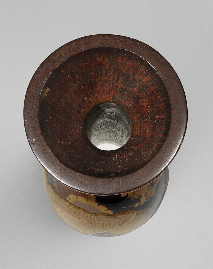 外側は江戸後期に挽き直され、黒蝋色塗地に、絵梨子地を交えた高蒔絵で柴垣に梅、雪輪を表している。